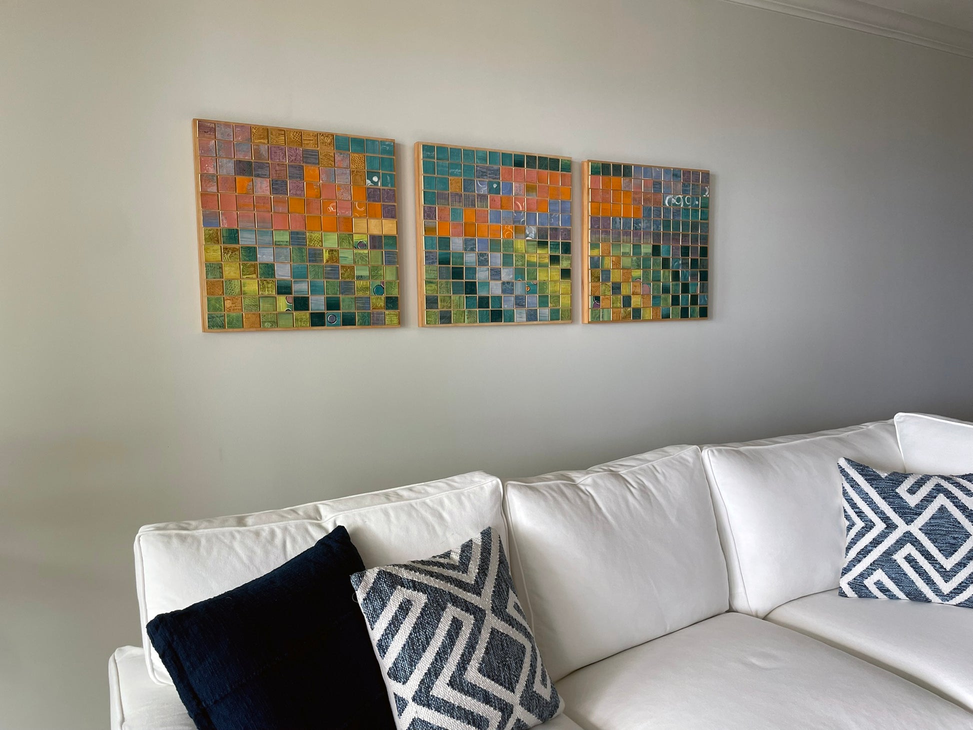 This unique ceramic and wood wall panel uses 2" tiles of various colors and textures to create an emotional landscape of the light on the marsh from day break to night. It is a custom piece made for a home in Beaufort, South Carolina that consists of three 24" x 24" x 2" panels.