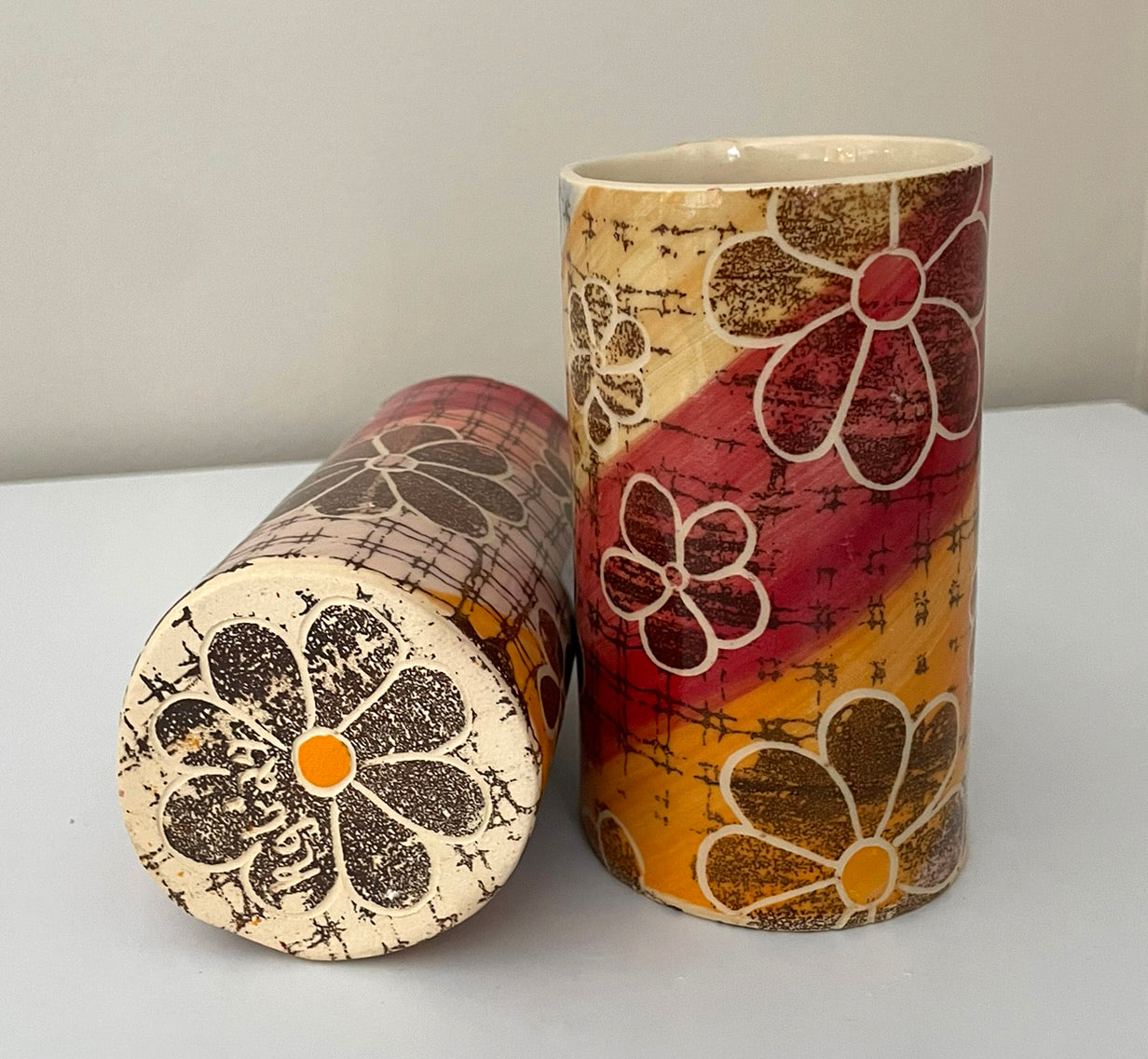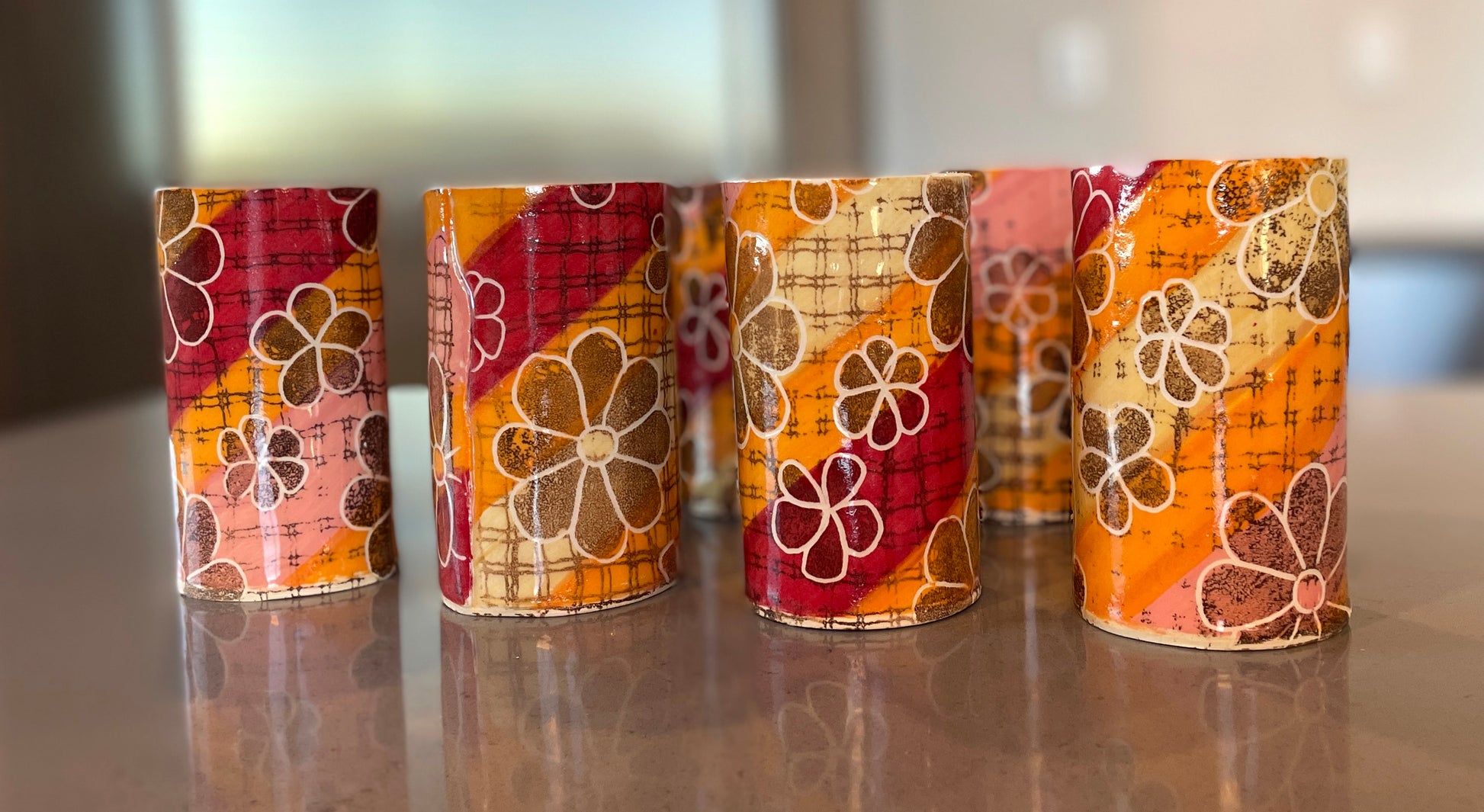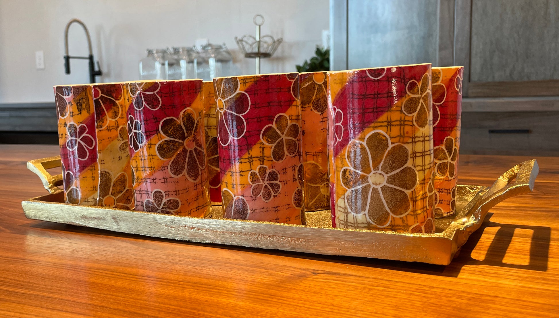 These throwback drinking glasses are an excellent addition to your dinner table or a fun way to add color and creativity to your desk. They are great gifts for you and your friends. A floral lace pattern is printed over a colorful background and then carved to add detail and depth to the design. The fun continues on the bottom of the cup. They measure 4.5" tall with a diameter of 2.5".